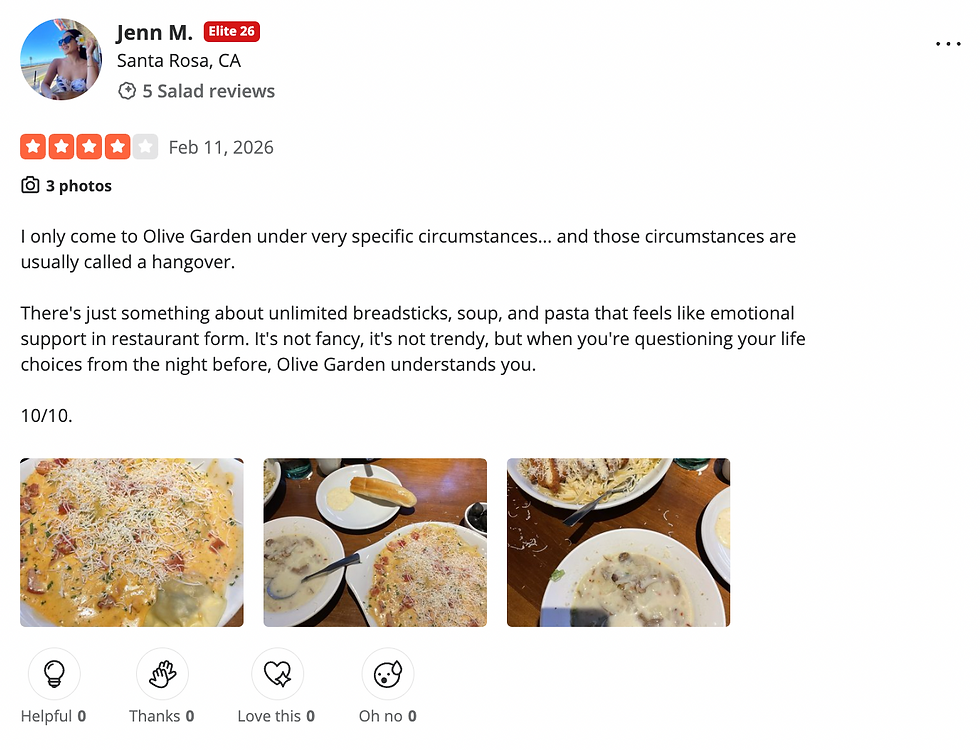 What I found instead was what I believe to be the most perfect review I have ever read. Funny, succinct, and sensible. Olive Garden gave you the exact experience you needed in that moment, but you still gave it four out of five stars because anyone with taste knows you just can't give it the whole five.